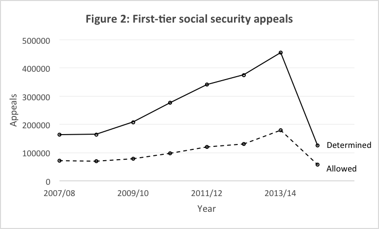 The dramatic decline in social security appeals has been attributed to two main causes: (1) the reduction in the volumes of initial decision-making in two of the main benefits: employment and support allowance and personal independence payments; and (2) the introduction of mandatory reconsideration. From the DWP’s perspective, mandatory reconsideration (MR) has been successful to the extent that it has helped to resolve more disputes without the need for appeal. However, in 2014, the Commons Work and Pensions Committee raised the concern that MR may deter some individuals from appealing even though they might be successful because it inserts another stage in the process which some individuals may find too onerous. In other words, if a claimant has already been told “no” at least twice – once following the initial claim and secondly through MR – then he or she might be inclined just to give up rather than pursue their claim to the tribunal stage. This is just one of the many areas in which it would be desirable for empirical research to be undertaken.