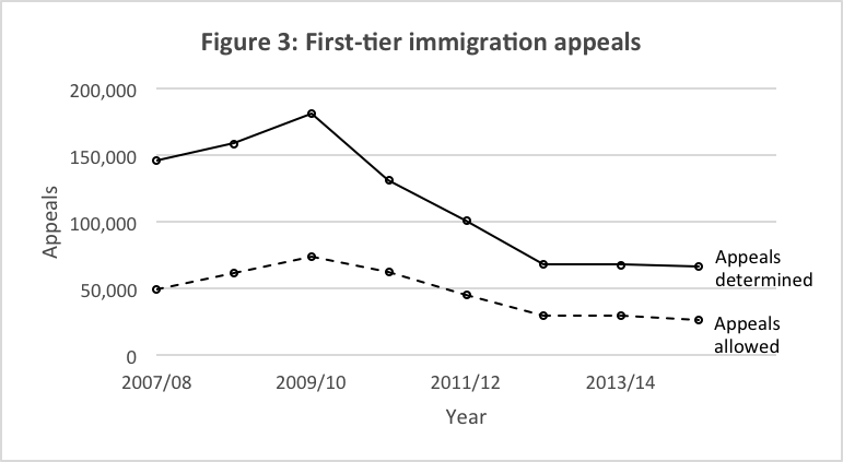 By contrast, consider the position as regards immigration appeals. The decline in immigration appeals has been less widely discussed. It may be attributed at a general level to the reduction in initial claims and refusal decisions. But there have been other matters, such as tougher immigration rules, the introduction of the immigration cap, and a slight reduction in asylum claims. But the major change here has been the widespread abolition of appeal rights under the Immigration Act 2014. Most ordinary immigration appeals against the refusal of leave to enter the UK and leave to remain have now been withdrawn. The only remedies now are: (1) administrative review within the Home Office; (2) an appeal on human rights grounds, but not full grounds of appeal; and (3) judicial review by the Upper Tribunal (Immigration and Asylum Chamber).
