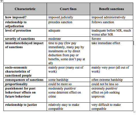 Vulnerable claimants are most likely to be sanctioned and, despite the availability of hardship payments, many of those who are sanctioned experience enormous hardship. Anecdotal evidence suggests that many of them end up becoming homeless, using food banks and resorting to crime. It is hard to see how these shortcomings could be rectified and it follows that benefit sanctions, as they have developed in the UK, are incompatible with justice. salient characteristics of court fines and benefit sanctions are compared in Table 4.