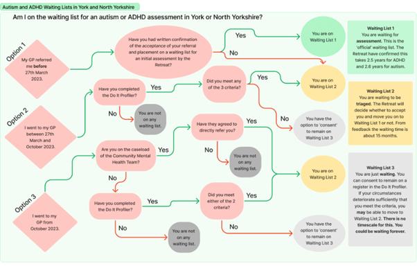 The York Disability Rights Forum created a flow chart in November 2023 to illustrate the confusion of who is on which waiting list. Since this chart was published, the waiting times have increased for those on ‘Waiting List 1’ from 2.6 years for autism assessments to 3.2 years: